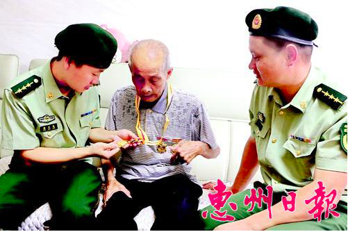 慰问抗战老兵 2018年07月06日 20:21 Joyue-Chang 为纪念“七七事变”81周年,日前,广东公安边防总队惠州边检站组织官兵代表来到驻地街道看望慰问东江纵队抗战英雄王马才老人,聆听老人讲述抗战故事。 (时间:2018年7月6日 来源:惠州日报 作者:姚亚超 通讯员:罗马 摄影报道)