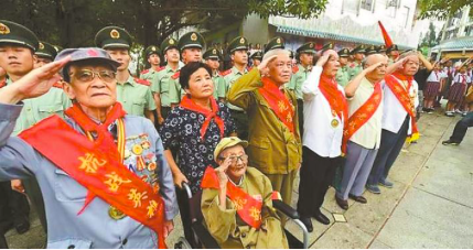 陈敏学(左一)老人与老兵一起参加国防教育活动。