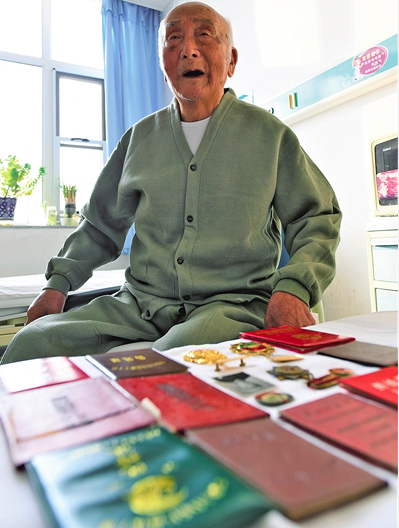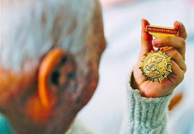 在他病房的床头柜上,静静地摆放着中国人民抗日战争胜利70周年纪念章。这枚奖章是党中央、国务院、中央军委向约21万名抗战老兵和为中国抗战胜利作出贡献的国际友人或其遗属颁发的,饱含着国家和人民对抗战英雄们的崇高敬意。